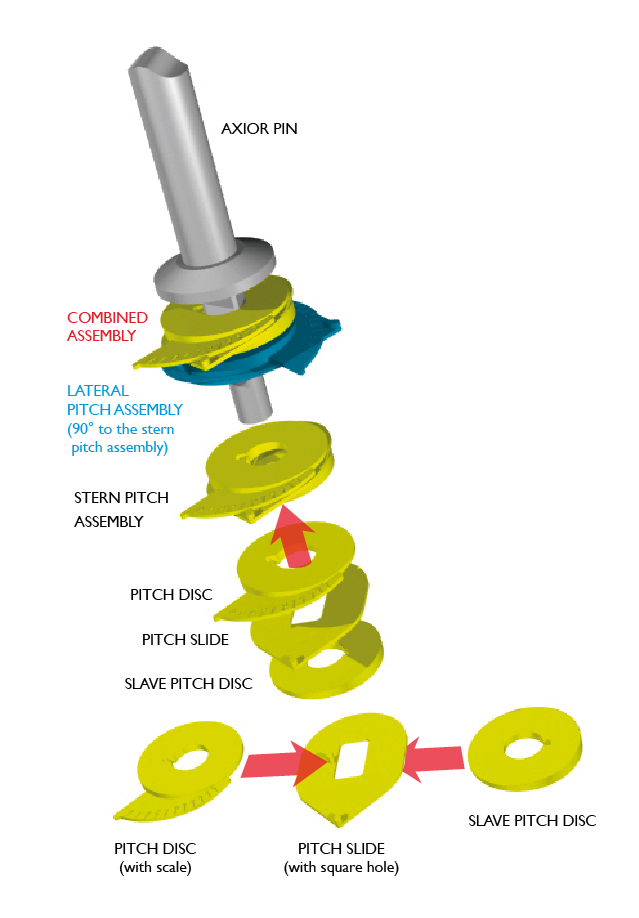 1. The pitch components provide precise adjustment on two axes at right angles. By convention we assemble as shown in the illustrations. The Combined Assembly shows a port/stroke–side set–up. The yellow components face astern to control stern pitch, the blue ones face should inboard to control lateral pitch.