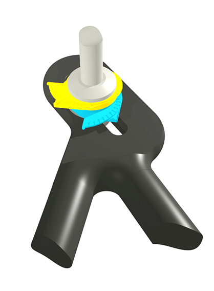 3. Now add yellow pitch slide, facing as indicated, sliding its slot over the squared shank and engaging its peg into the notch in the first component.